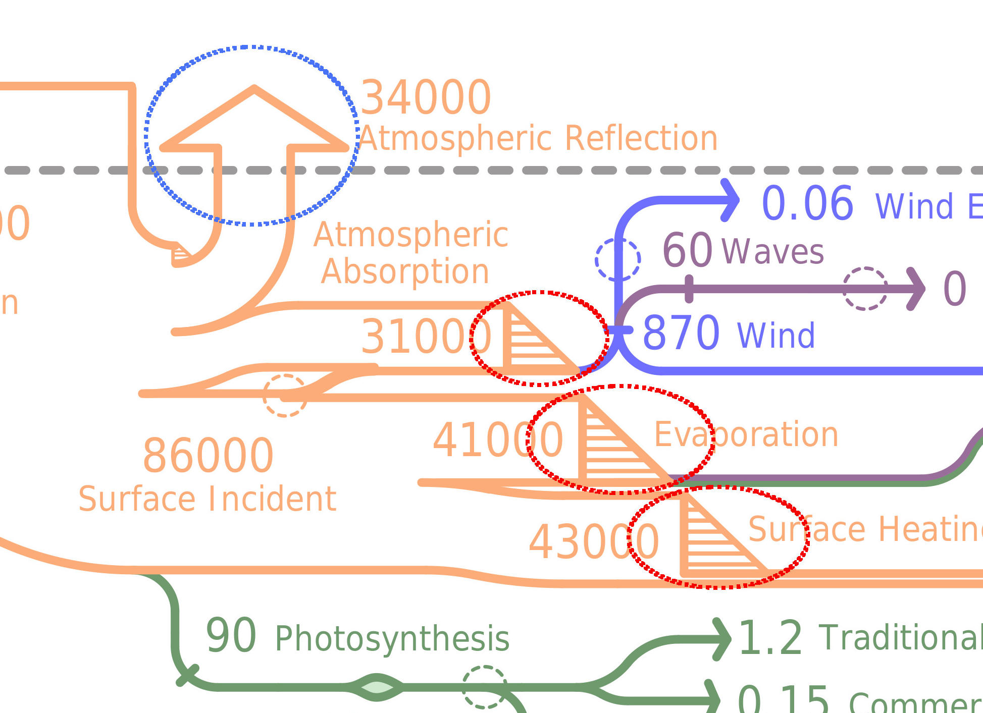 L’excellent poster du GCEP permet de suivre en détail le cheminement de l’énergie solaire. On y retrouve tous les flux et tous les stocks d’énergie de notre planète. Un bijou pour qui veut comprendre en profondeur le potentiel des énergies renouvelables [1].