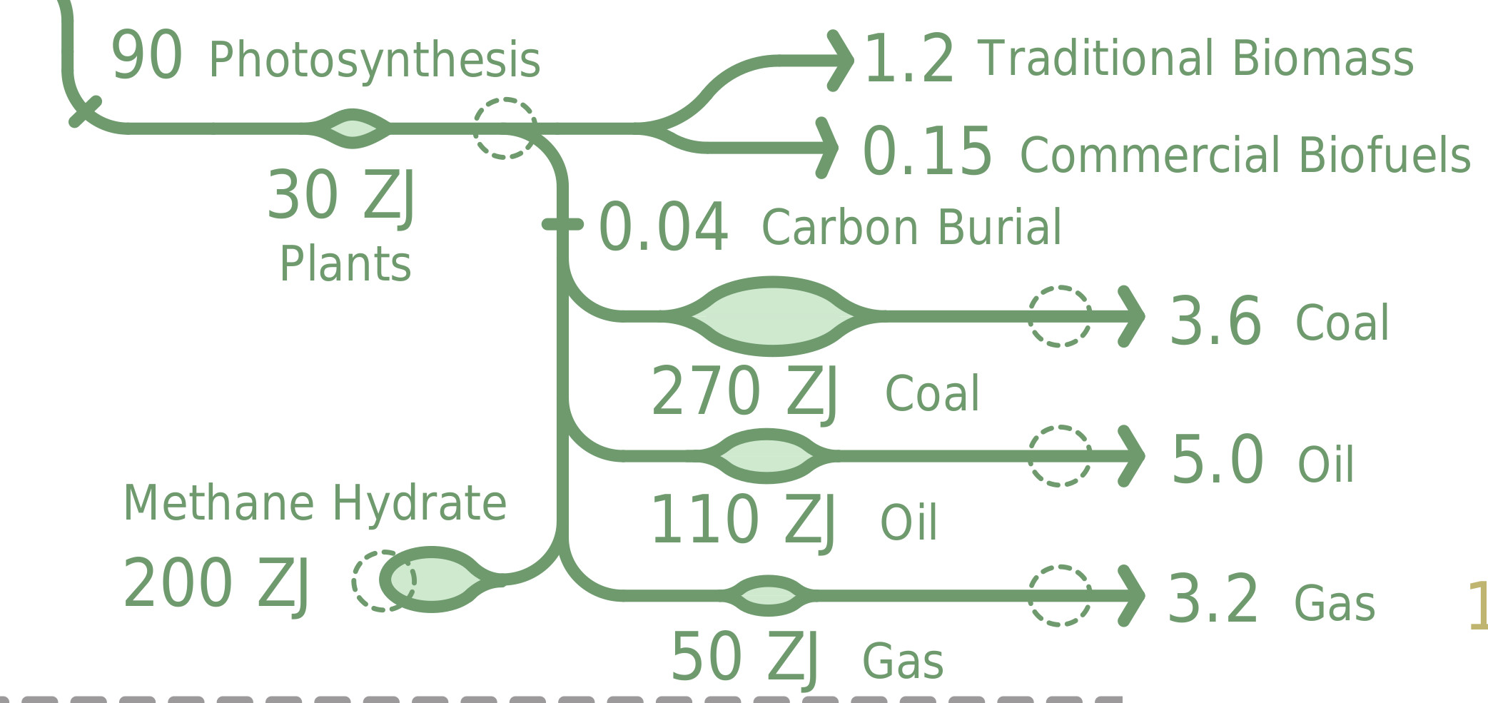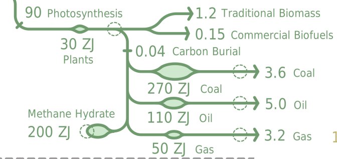 D’autre part, le graphique permet aussi de voir qu’une petite partie de la biomasse est enfouie, 0,04TW par an sur les 90TW annuels assurant la croissance de la biomasse. Ces 0,04TW d’énergie se transformeront en pétrole gaz et charbon au cours des millions d’années qui viennent. On sait aujourd’hui qu’il est indispensable d’abandonner l’essentiel de ces réserves fossiles sauf si l’on accepte un réchauffement climatique tel que l’humanité ne puisse plus y résister.