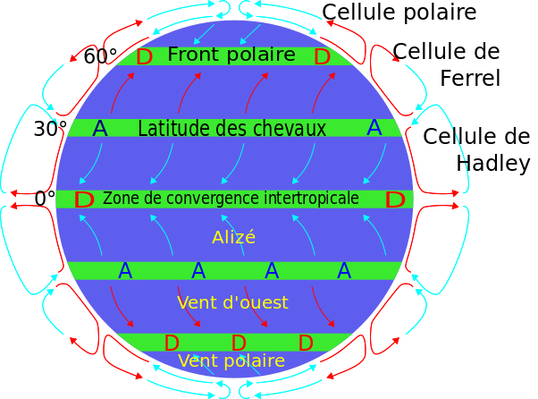 Tout démarre à la base des cellules de Hadley, là où l’apport solaire est le plus important. C’est là que la dynamique de la grande machinerie de la circulation atmosphérique se met en place. L’air s’échauffe et un peu d’eau de surface s’évapore. Cet air chaud et humide s’élève, emportant la vapeur d’eau et son double contenu en énergie : chaleur latente, qui se concrétisera lors de la condensation de la vapeur et d’autre part l’énergie gravitationnelle qui se libérera lors de la chute de la pluie suivie par son écoulement vers la mer.