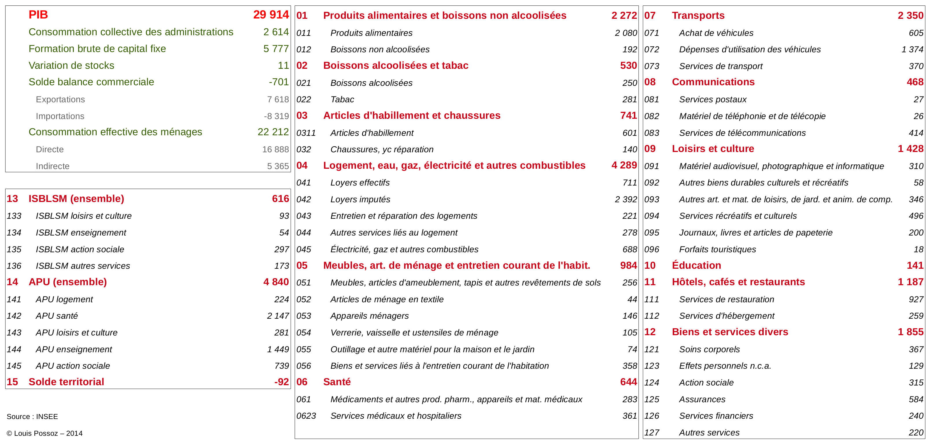 Le tableau qui suit présente une décomposition complète du PIB français, du point de vue de la demande et ramené à un individu. Bien entendu, l’individu moyen est une abstraction et chaque cas particulier peut s’en écarter plus ou moins nettement. Si on s’intéresse à la consommation d’un ménage, il faudra multiplier les chiffres du tableau par la taille du ménage, par exemple par trois pour un ménage de trois personnes. La prudence est cependant de rigueur, un enfant n’a certainement pas le même niveau de consommation qu’un adulte et, dans la réalité, il y a aussi des riches et des pauvres.