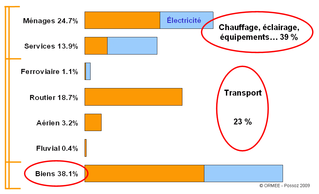 Il ne faut pas oublier que la rubrique transport regroupe le transport des personnes et celui des marchandises, en parts approximativement égales. La portion bleue (électricité) correspond pour l’essentiel au transport ferroviaire.