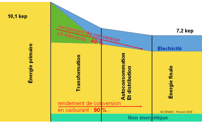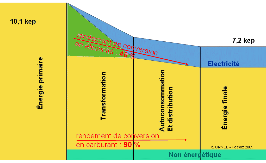 La transition entre énergie primaire et énergie finale est schématisée sur le graphique de drote. Selon notre bonne habitude, les énergies sont comptées en kep /j/p.