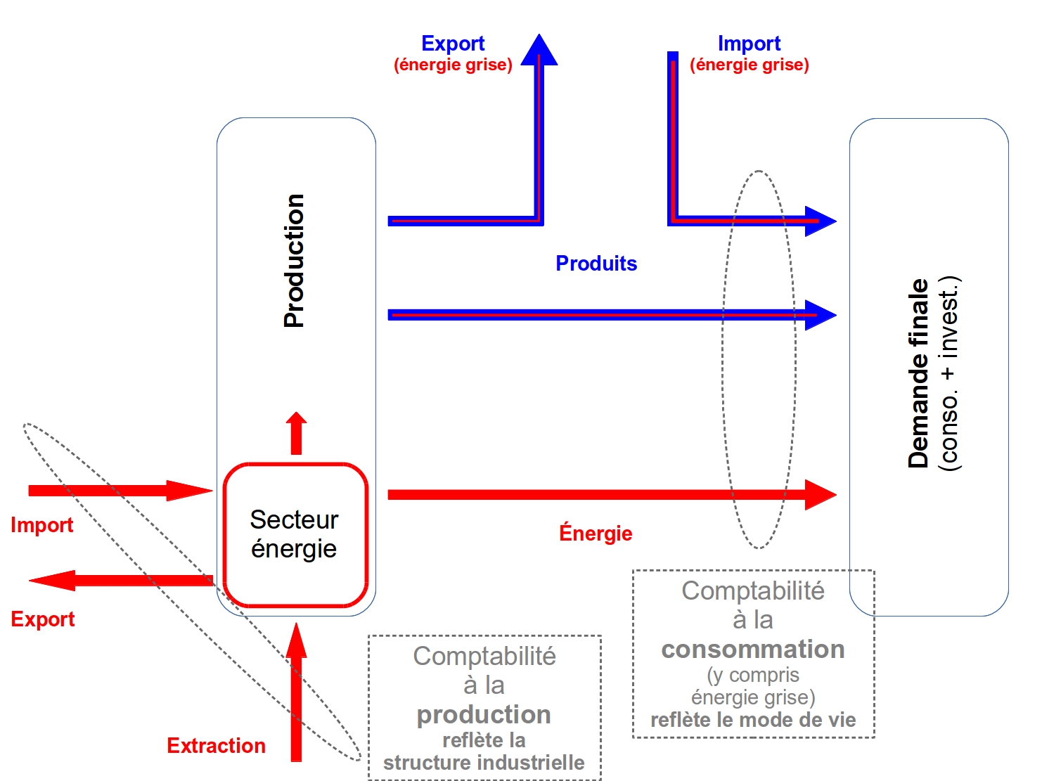 Selon cette "vision" classique, on considère que l’énergie qui est consommée dans un État est celle qui est extraite du territoire national augmentée des importations d’énergie et diminuée des exportations.