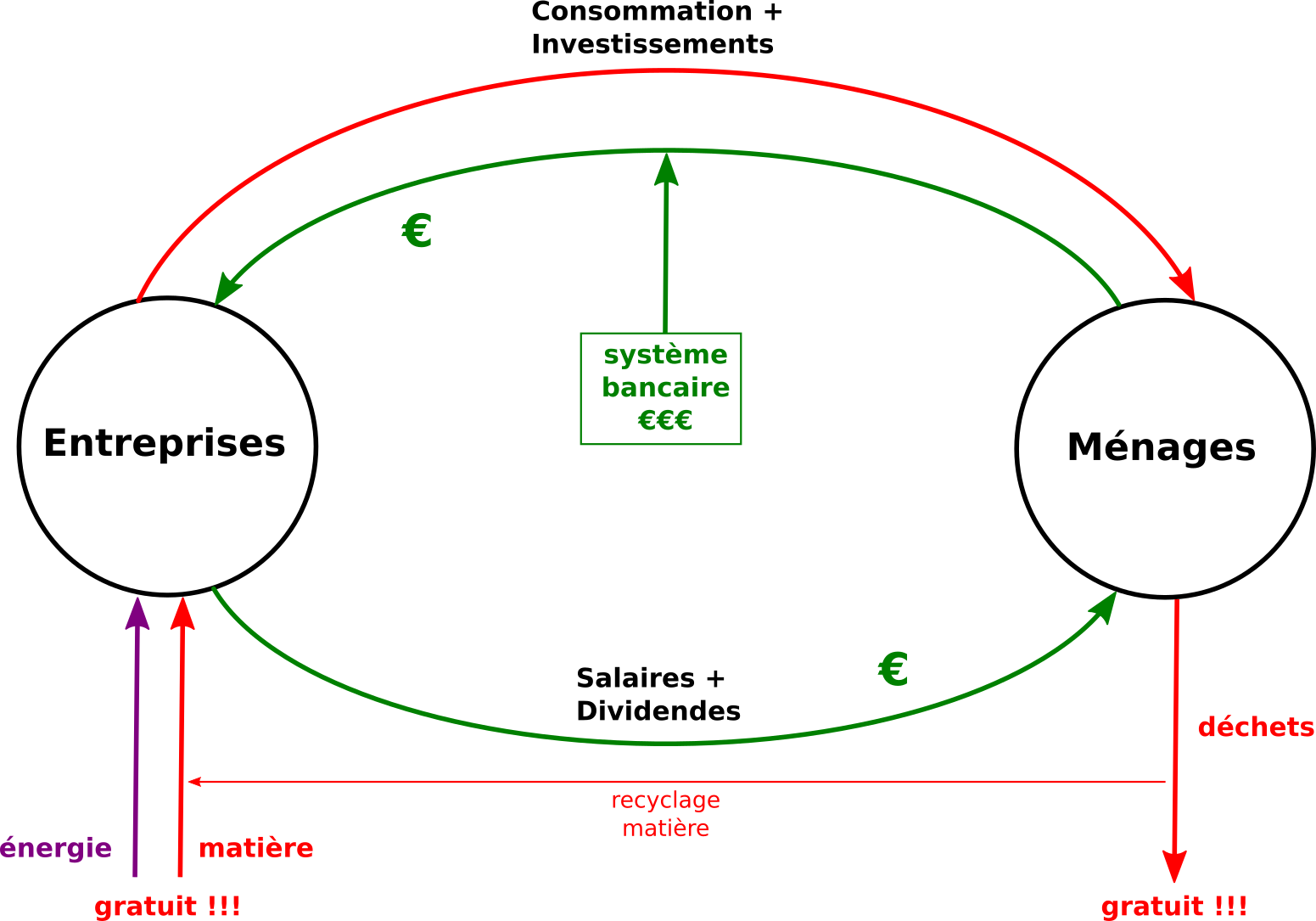 Sue le schéma simplifié de la machinerie économique ci-dessus apparaît une boucle monétaire (en vert) et une circulation physique composée de matière (en rouge) et d’énergie (en violet). À gauche, les entreprises produisent ce que, à droite, les ménages achètent, pour leurs consommations ou pour leurs investissements.