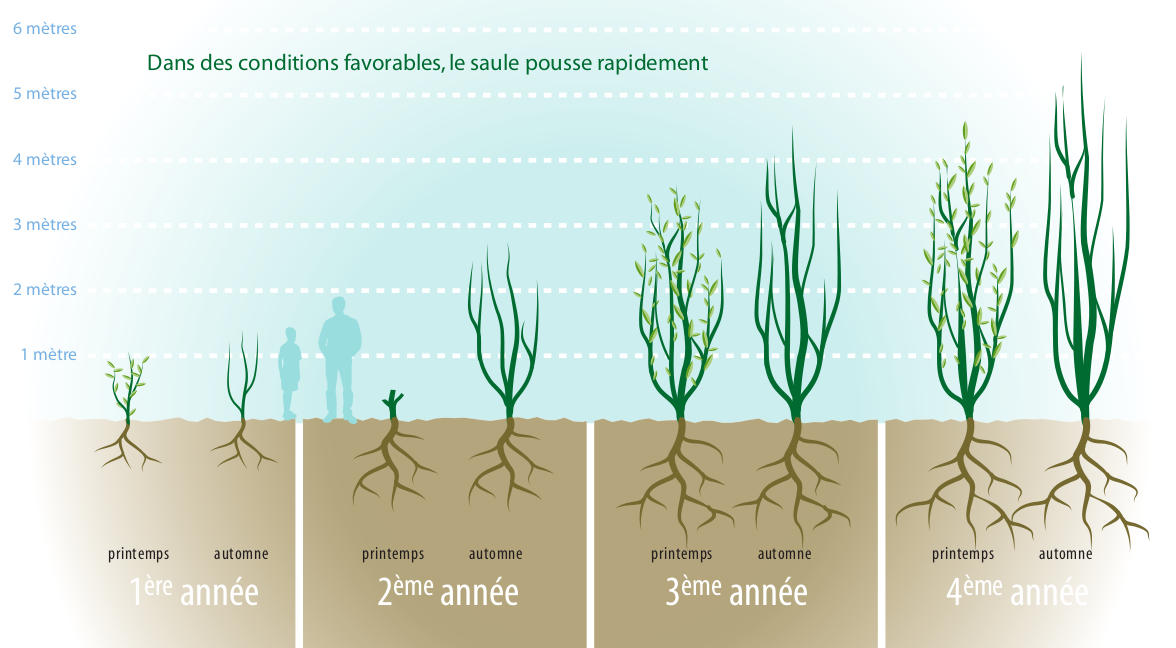 La culture du saule permet de produire du bois de chauffage assez rapidement. L’idée est de le cultiver en "taillis à très courte rotation" (TTCR) [3].