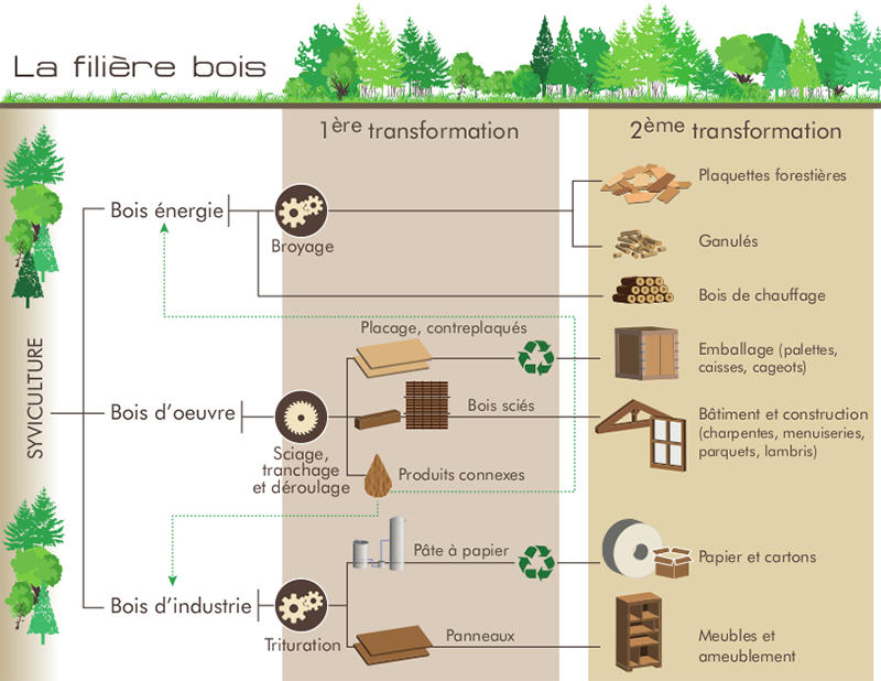 - Le bois d’industrie et/ou bois énergie. Le premier est destiné à la fabrication de tous les produits industriels à base de bois : papiers et cartons, bois agglomérés, etc. Le second comprend les bûches, les plaquettes de bois obtenues par broyage des branches ainsi que les granulés de bois faits de déchets fortement comprimés. Ces bois, interchangeables, représente au total approximativement 28% du volume en bois de l’arbre entier.
