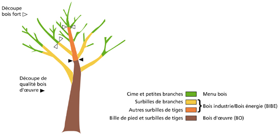 - Le menu bois, c’est-à-dire toutes les chutes d’un diamètre inférieur à 7 cm. Ce bois représente environ 10% du volume bois de l’arbre. Cependant, il s’agit d’un bois difficilement récoltable, et dont la récolte peut être, dans certaines situations, préjudiciable pour la fertilité des sols (l’essentiel des éléments minéraux nécessaires à la croissance des peuplements se trouve aux extrémités des rameaux, dans les écorces et les feuilles) [5].