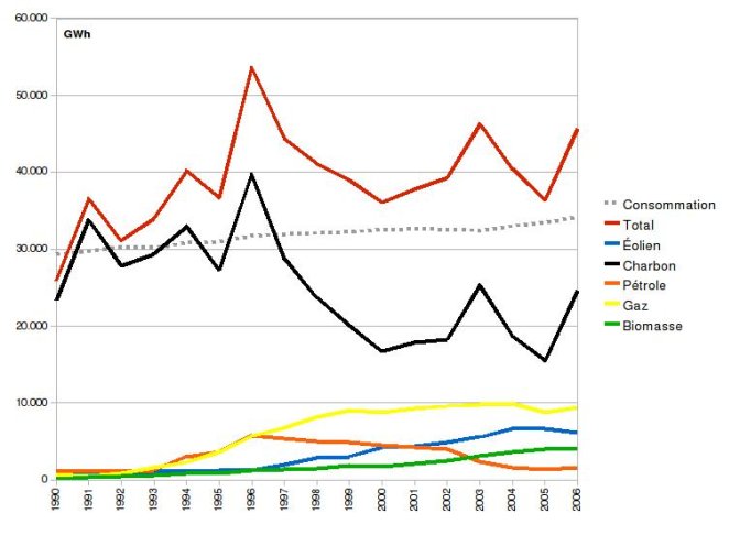 Le graphique de droite indique que la production totale d’électricité du Danemark a presque toujours été supérieure à sa consommation totale d’électricité - elle-même en croissance légère mais constante - ce pays étant exportateur d’électricité. Au début des années 1990’, l’électricité y était presque exclusivement produite dans des centrales au charbon. Par la suite, le Danemark a poursuivi une politique de diversification, augmentant d’abord la part des centrales au fuel (temporairement) et au gaz, puis en développant la production éolienne et, dans une moindre mesure, celle des centrales à biomasse. Ainsi, la part du charbon dans la production de l’électricité a pu être nettement réduite.