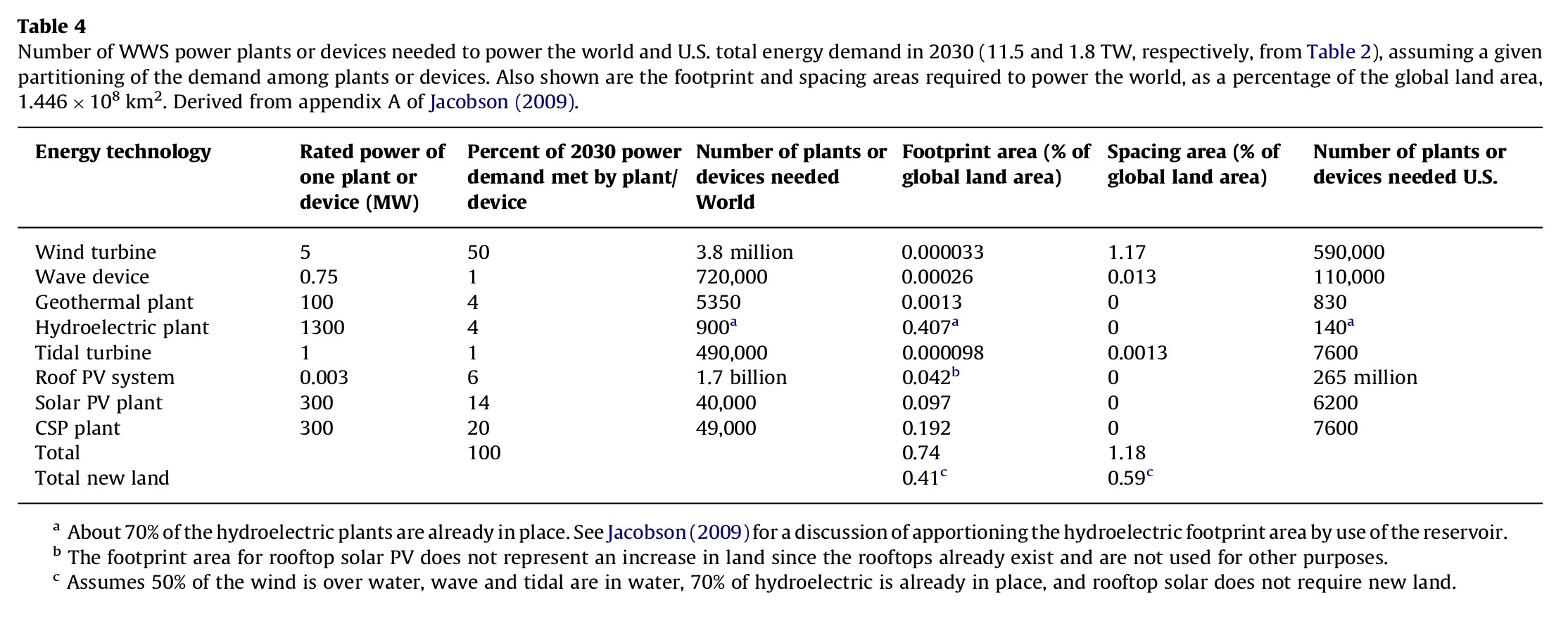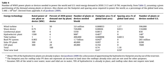 Jacobson et Delucci répartissent ensuite cette production d’énergie entre les différentes technologies renouvelables que sont l’énergie éolienne, l’énergie de la houle, la géothermie, l’hydroélectricité, le photovoltaïque (toitures ou champs) et le solaire à concentration. Dans un tableau figurant dans l’article (voir ci-contre) la première colonne précise le type d’équipement, la seconde donne la puissance unitaire – puissance de chaque équipement en MW – tandis que la quatrième correspond au nombre d’équipements de ce type qui seraient nécessaires au niveau mondial.